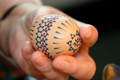 Nun kann man schon mit den ersten Mustern und Symbolen das sorbische Osterei verzieren. Den Kopf der Nadel in das heiße Wachs tauchen und Ornamente, wie Punkte oder Striche, auf das Ei bringen. Das Wachs wird auf der Eierschale sofort fest, hier ist eine ruhige Hand gefragt. Denn dort wo das Wachs drauf ist, auch falsch getupft wurde, nimmt das Ei keine Eierfarbe mehr an.