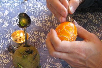 Sie gehen anfänglich genauso vor, wie bei der einfarbigen Wachstechnik. Die Kartoffel halbieren und mit der glatten Seite auf den Tisch stellen. Den Löffel um 90 Grad biegen, so dass Kerzen- oder Bienenwachs in den Löffel gegeben werden kann. Löffel mit dem Stiel in die Kartoffel oder in das Glas mit Sand stechen. Unter den Löffel die Kerze stellen, damit das Wachs erhitzt wird.