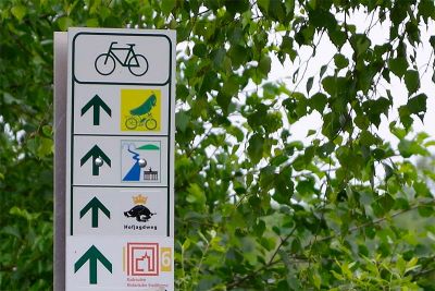 Passend zum Thema des Radweges dient eine „gekrönte Sau“ als Streckenbezeichnung.