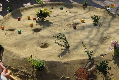 Die Grube sollte etwa einen Meter breit und zwei bis drei Meter lang sein. Beim Ausheben der Grube entsteht eine abschüssige Bahn, die am hinteren Ende etwa 30 bis 40 cm tief ist. Und dann kann das Spiel um die bunten Eier schon beginnen.