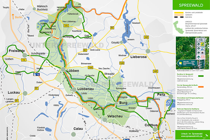 Die Beschreibung der Route hat Cottbus als Start- und Zielort, bietet Infos über Vetschau, Lübbenau, Lübben und Peitz. Zudem wird das gesamte Naturschutzgebiet Spreewald, das zum UNESCO-Biosphärenreservat ernannt wurde, beschrieben.