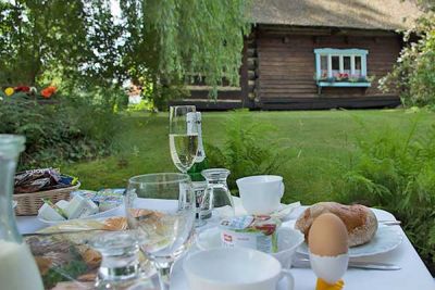 Die aufgehende Sonne scheint während der Frühstückskahnfahrt im Spreewald durch die Baumkronen. Lassen Sie sich die verschiedenen Köstlichkeiten auf dem liebevoll nur für Sie eingedeckten Kahn schmecken. Kaffee, Kakao oder Tee, vielleicht auch ein Gläschen Sekt. Dazu frische Hörnchen, Brötchen oder Vollkornbrot, verschiedene Aufschnitte, Marmelade, Rührei, Obst usw. Genießen Sie Ihr Frühstück auf dem typischen Spreewaldkahn während Ihrer Brunchkahnfahrt durch die Streusiedlung von Burg (Spreewald).