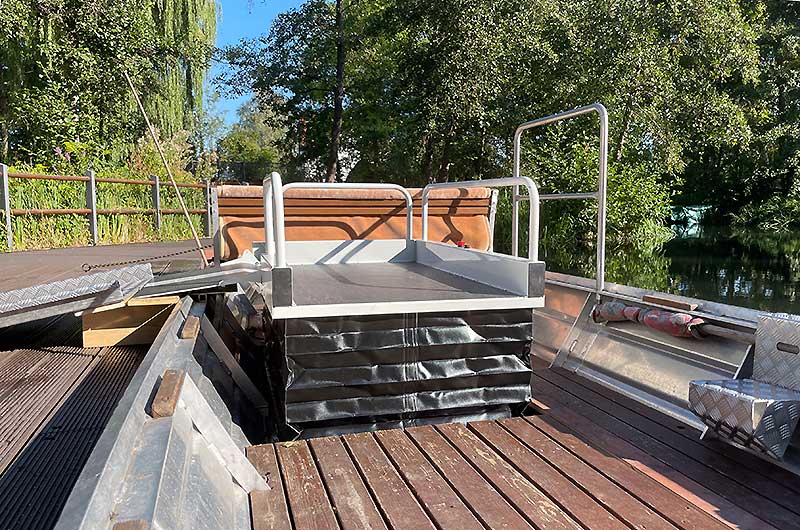 Der speziell angefertigte Kahn verfügt über eine Hebebühne. Über diese stabile Plattform können Rollstuhlfahrer und ihre Begleiter sicher ein- und aussteigen, ohne dabei auf Komfort und Sicherheit zu verzichten.